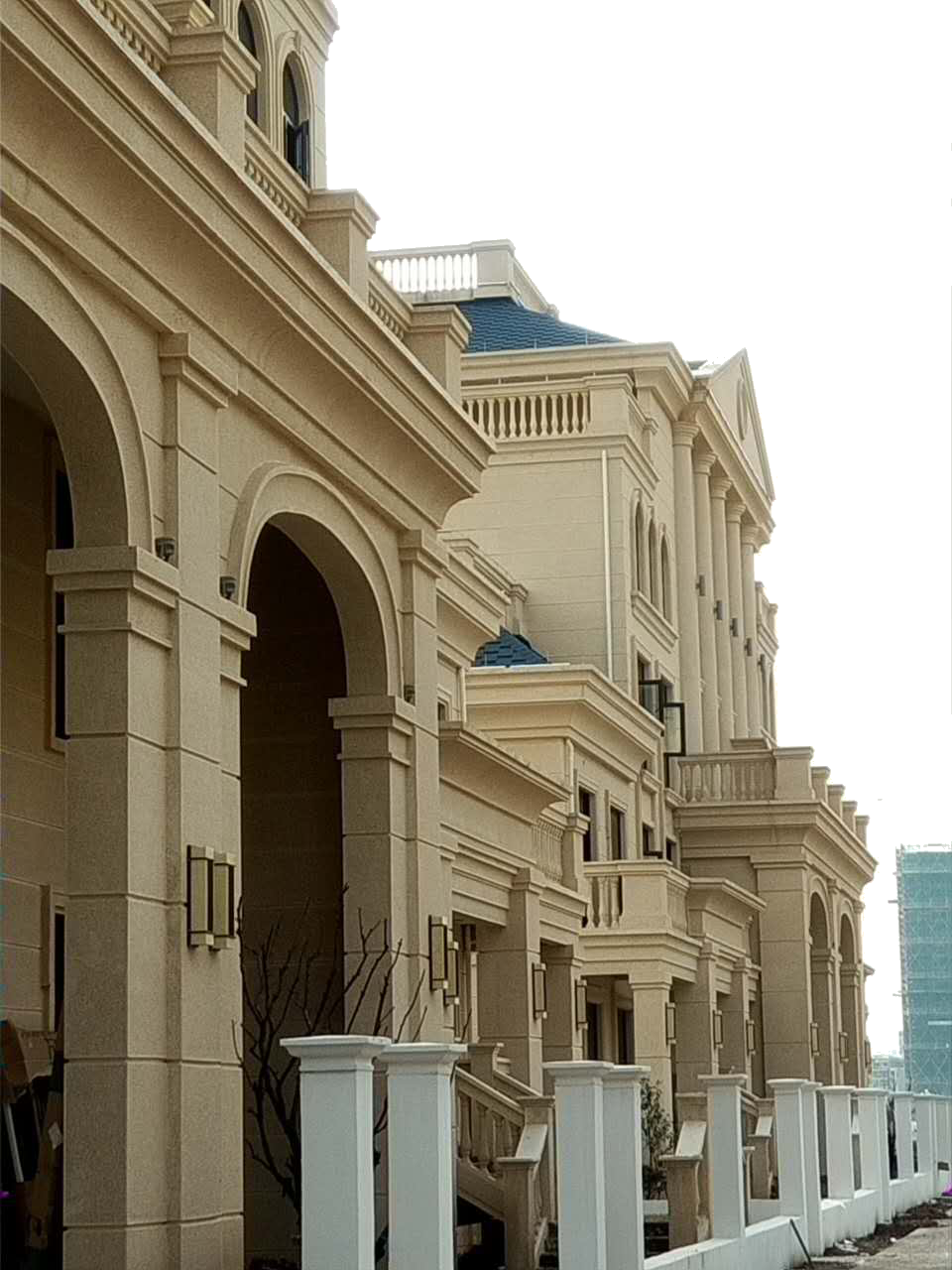 線條安裝采用后錨固的工法,同時,線條安裝過程中會存在碰壞、破損等現(xiàn)象,且因為部分腳手架的阻擋而切割局部線條,這樣就需要對破損或被切割的線條進(jìn)行修補。破損或被切割較大的部位,須先清理待修部位,并用EPS板材切割成與缺損部位相同體積和形狀的EPS材料,用專用粘結(jié)劑粘貼到位,表面再覆蓋抹面砂漿和耐堿網(wǎng)格布,并搭接到周邊50mm以上。Z終完成面須與周邊大面形成一個整體,確保平整、光順。